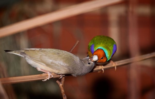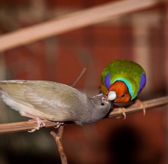 Gouldians thrive in a mixed aviary with small to medium-sized seed-eating birds such as parrot finches, society finches, canaries, zebra finches, cordon blues, owl finches, and other Australian finches. However, they can become stressed when housed with more aggressive species like budgies, rosellas, quail, or doves. As social birds, Gouldians prefer to live in a colony setting.